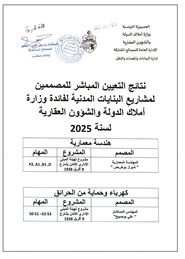 نتائج التعيين المباشر للمصممين لمشاريع البنايات المدنية لفائدة وزارة أملاك الدولة و الشؤون العقارية لسنة 2025 Post published:4 يونيو 2025 Post category:الأخبار / تكوين قد يعجبك ايضا في جلسة عمل مع والي القصرين : الاتفاق مع مستغلي المقاطع الرخامية بمعتمدية تالة على تطبيق القانون 23 فبراير 2021 قابس: استرجاع عقارين دوليين بمنطقة العوينات 23 فبراير 2021 كاتب الدّولة لأملاك الدّولة والشؤون العقارية يتفقد الإدارة العامة للتصرف والبيوعات ويشرف على موكب تنصيب المدير العام. 23 فبراير 2021
