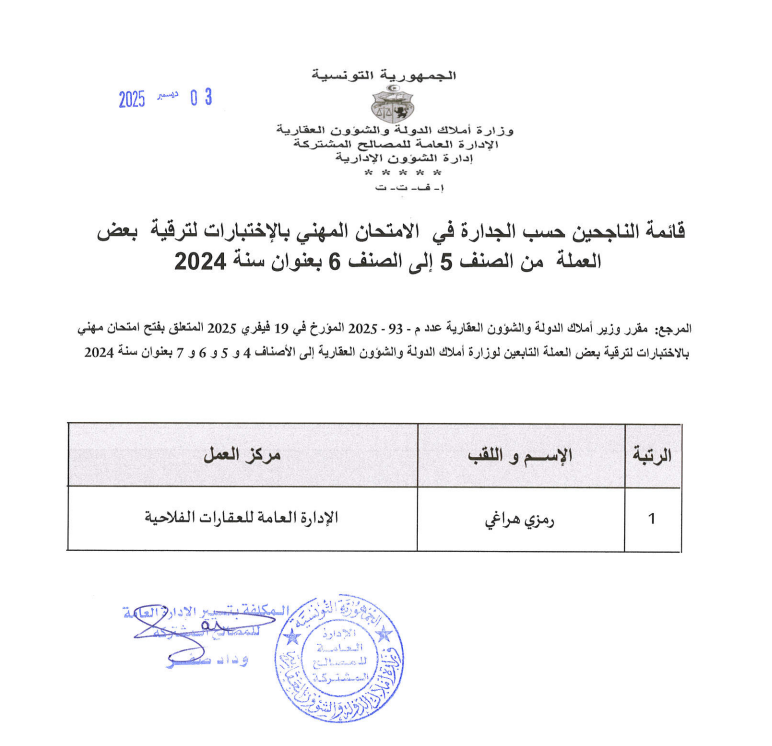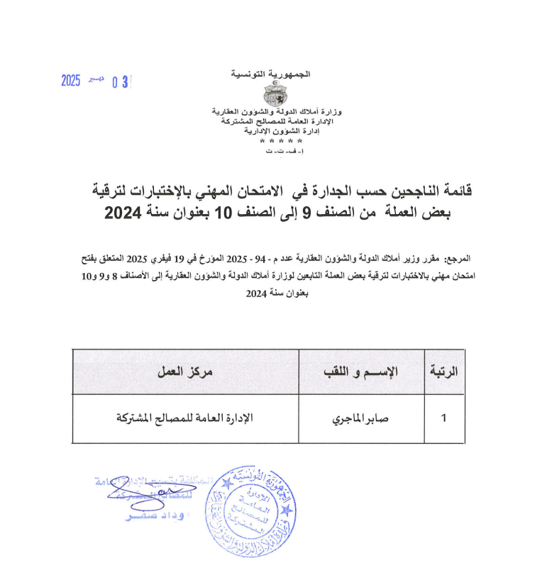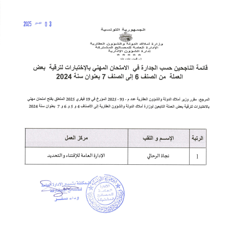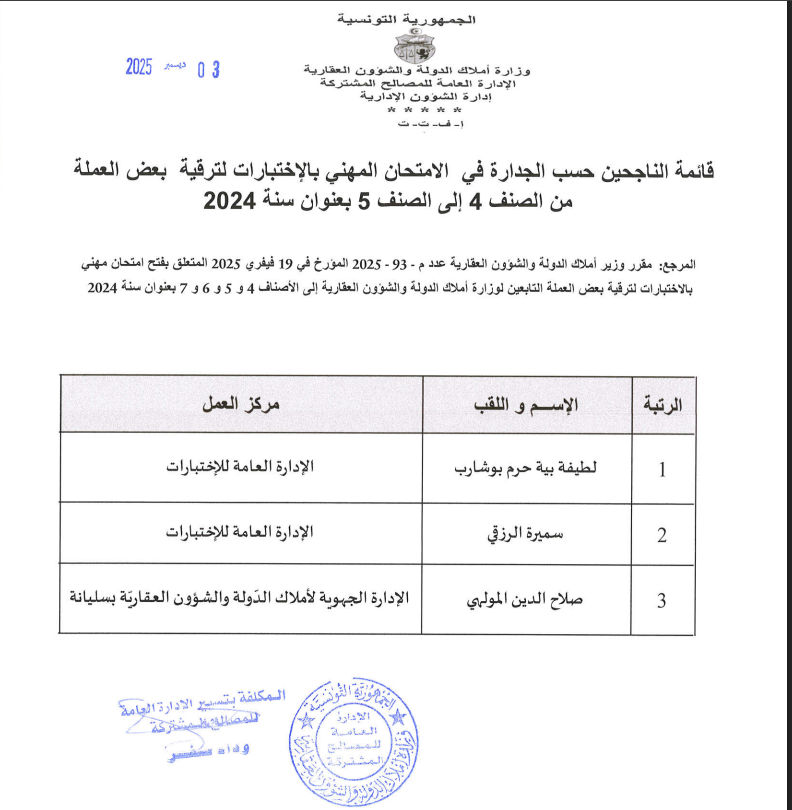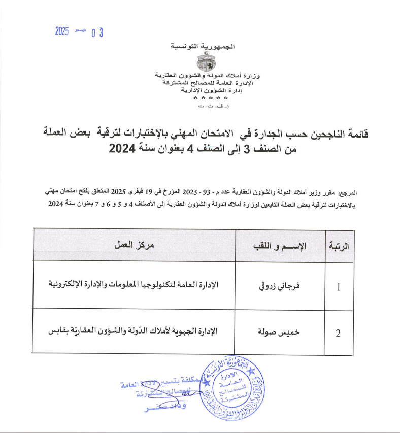 قائمات الناجحين حسب الجدارة في الإمتحان المهني بالإختبارات بعنوان سنة 2024. Post published:3 ديسمبر 2025 Post category:الأخبار / مناظرات داخلية قد يعجبك ايضا 19 نوفمبر 2025 قابس: استرجاع عقارين دوليين بمنطقة العوينات 23 فبراير 2021 وزارة أملاك الدّولة : استرجاع 228 هك من أراضي الدّولة في زغوان. 16 مايو 2023