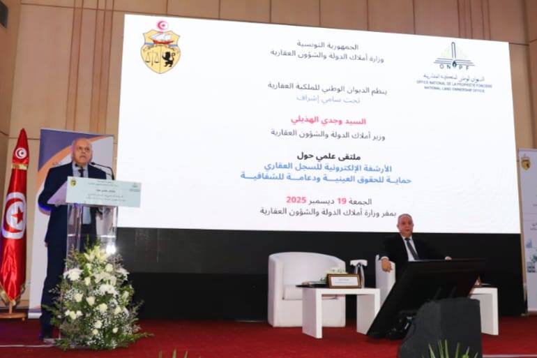 انتظم اليوم 19 ديسمبر 2025 تحت إشراف السيّد وجدي الهذيلي وزير أملاك الدولة والشؤون العقارية ملتقى علمي حول “الأرشفــــــة الإلكترونيّــــــة للسّجــــل العقــــاري: حمايــة للحقـــوق العينيّـة ودعامـة للشّفافيـة”.