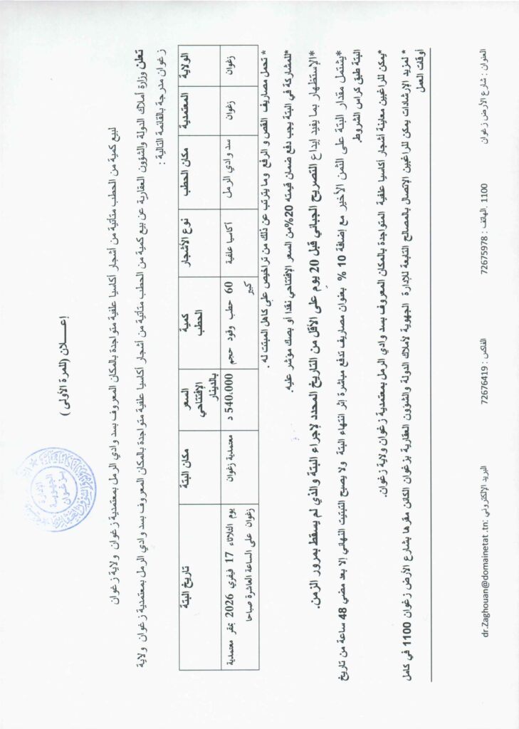 إعـــــــلان (للمرة الأولى) لبيع كمية من الحطب متأتية من أكاسيا بمعتمدية زغوان ولاية زغوان Post published:30 يناير 2026 Post category:الإعلانات / بتات وكراءات تحميل قد يعجبك ايضا إعلام بتأجيل بتّة المقرر إجراؤها بتاريخ 15 جوان 2022 15 يونيو 2022 تعلن وزارة أملاك الدولة و الشؤون العقارية عن عقار دولي فلاحي بولاية المنستير مدرج بالجدول التالي 23 فبراير 2021 إعلان بيع صابة زيتون على رؤوس اشجارها كائنة بالمكتبة العمومية الماي بمعتمدية جربة ميدون من ولاية مدنين 11 فبراير 2025